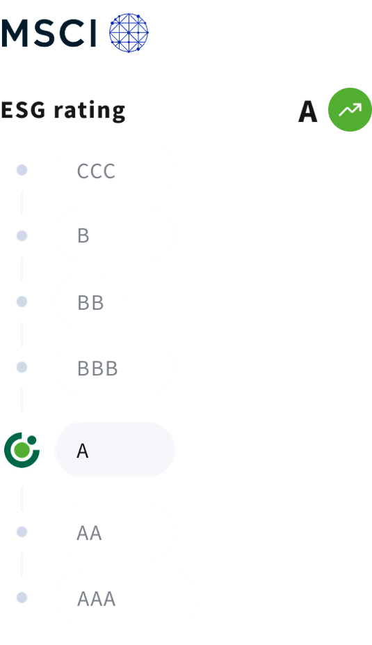 The MSCI ESG rating is designed to measure a company’s resilience to long-term, industry-relevant environmental, social and governance risks. A rules-based methodology is used to identify industry leaders and laggards, based on how exposed companies are to ESG risks and how well they manage these risks relative to their competitors. Their ESG ratings range from leading (AAA, AA), average (A, BBB, BB) to lagging (B, CCC).